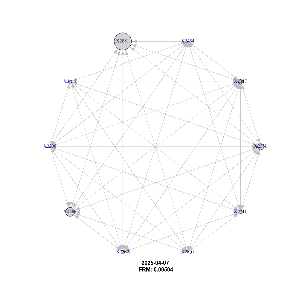 By analyzing the adjacency matrix, FRM@Taiwan provides insights into the network dynamics, identifying key players so called high co-stress company and their interrelations within these critical sectors.